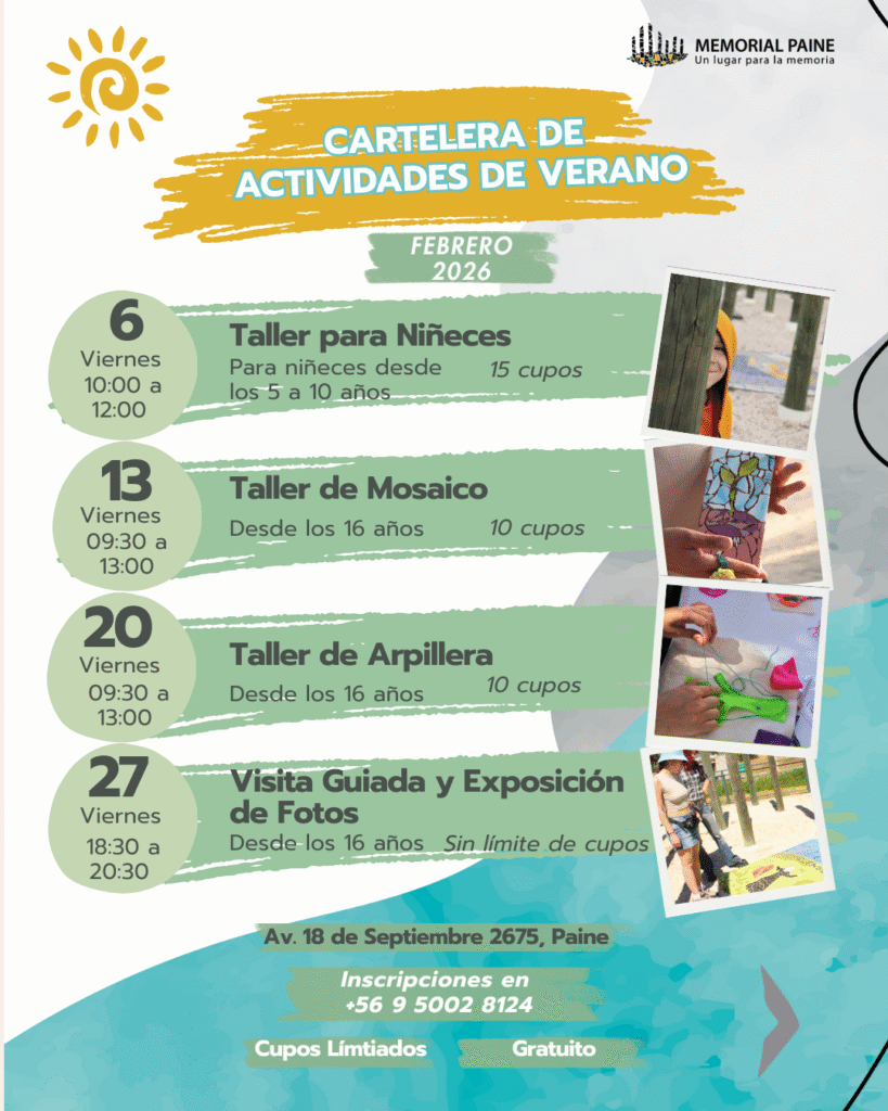 Taller para Niñeces -Taller de Mosaico -Taller de Arpillera – Visita Guiada y Exposición de Fotos, son las actividades que te proponemos vivir en Memorial Paine. Te esperamos en Av. 18 de Septiembre #2675, Paine, todos los viernes de febrero.