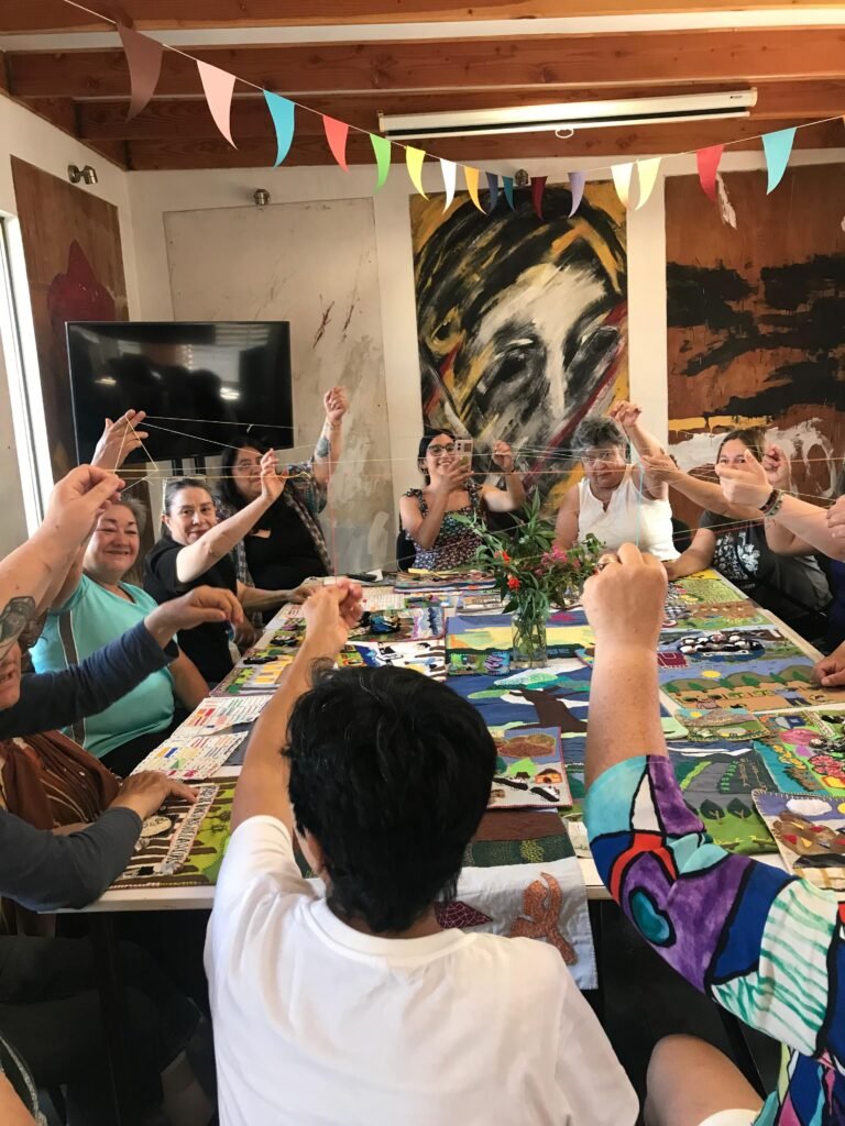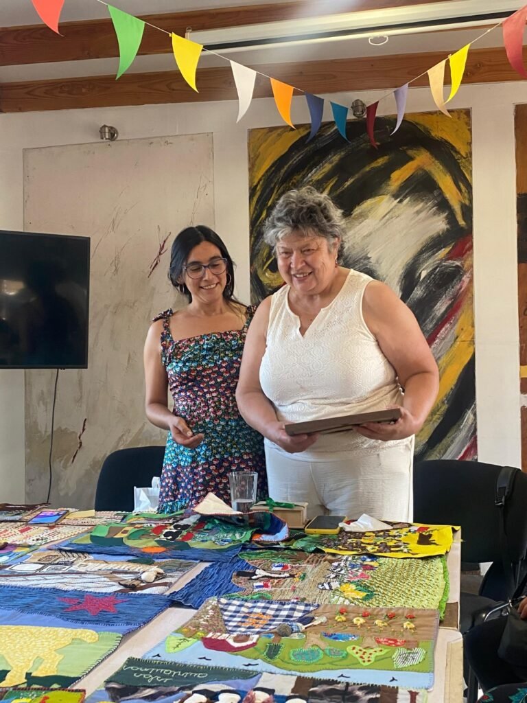 El taller comenzó con un encuentro de diálogo fraterno entre las arpilleristas en formación y las cultoras María Teresa Madariaga y Patricia Hidalgo Astorga, quienes fueron declaradas tesoros humanos vivos el año 2012.