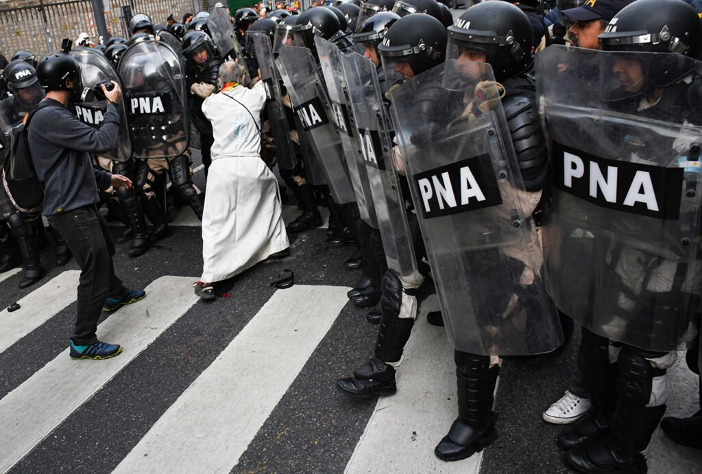 Su fotografía retrata una marcha de jubilados que se realiza semanalmente en Argentina para exigir pensiones dignas, protestas que suelen ser reprimidas. En la imagen, el padre Paco aparece rodeado por fuerzas de infantería, convirtiéndose en símbolo de resistencia frente a la violencia estatal.