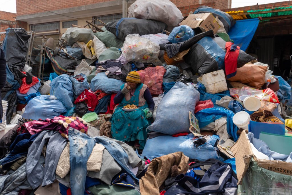 “La montaña del olvido” documenta el comercio de ropa usada y objetos de segunda mano en la Feria 16 de Julio, uno de los espacios comerciales más grandes de Bolivia. La acumulación de desechos se convierte en una metáfora del consumo global y sus contradicciones: lo que unos descartan es el sustento diario de otros.