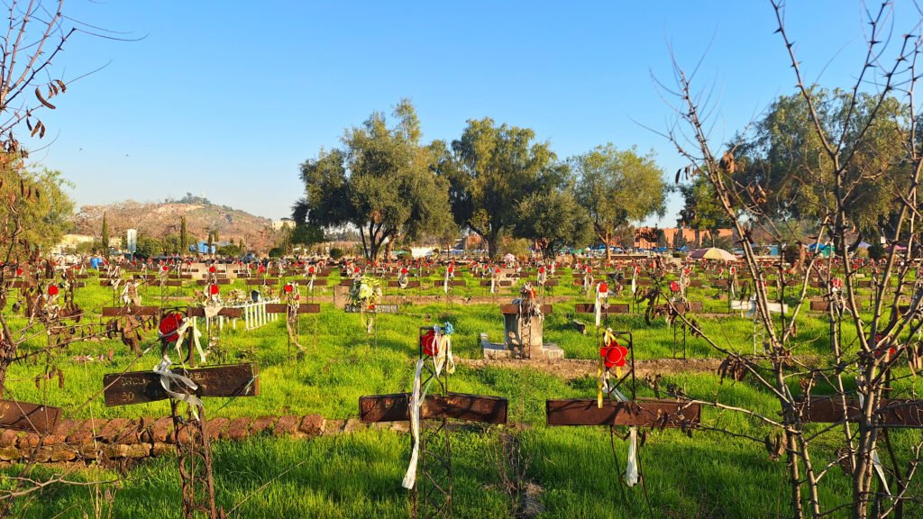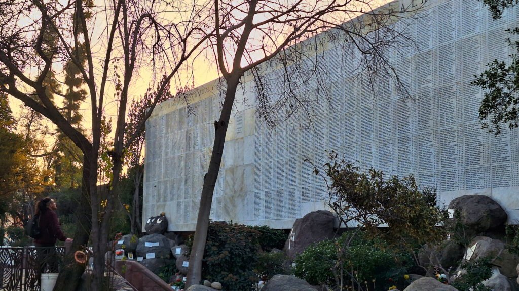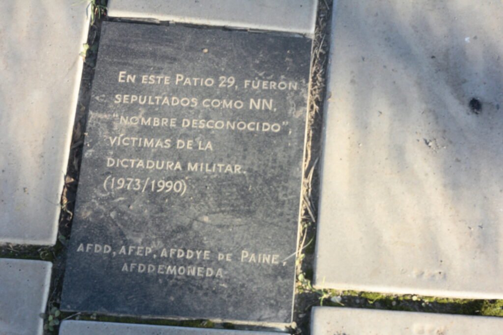 En el Cementerio General de Santiago, tras visitar algunos mausoleos y lápidas que forman parte del patrimonio histórico y arquitectónico del país, se emprendió camino hacia Patio 29, un espacio que queda en los límites del cementerio, con un hermoso paisaje que hoy, gracias a la frondosa naturaleza característica de esta época del año, puede verse con más vida, pero esconde una cruda historia.